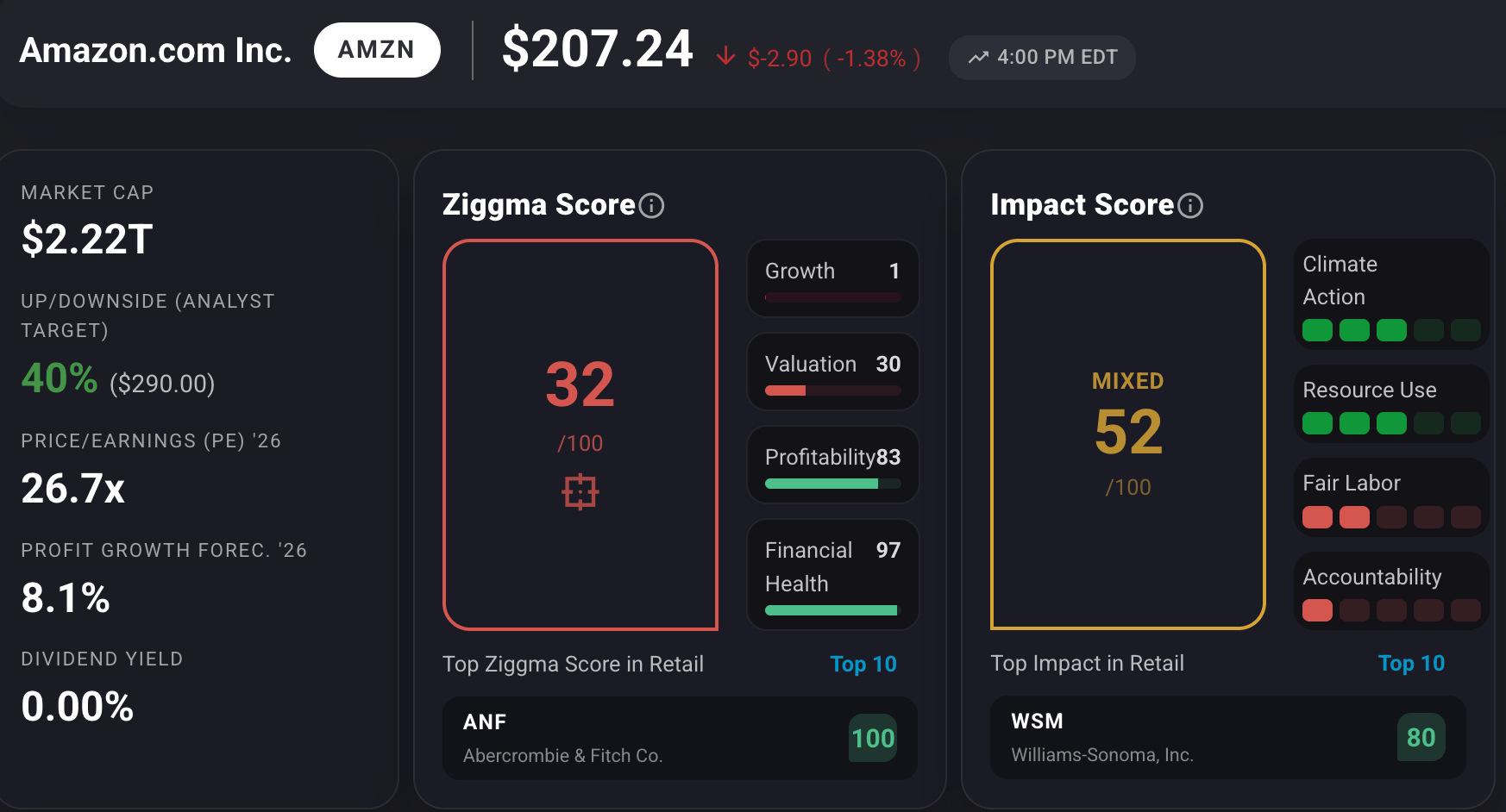 AMZN stock has a low Ziggma score of 32, as it ranks lower than its peers in growth and valuation.