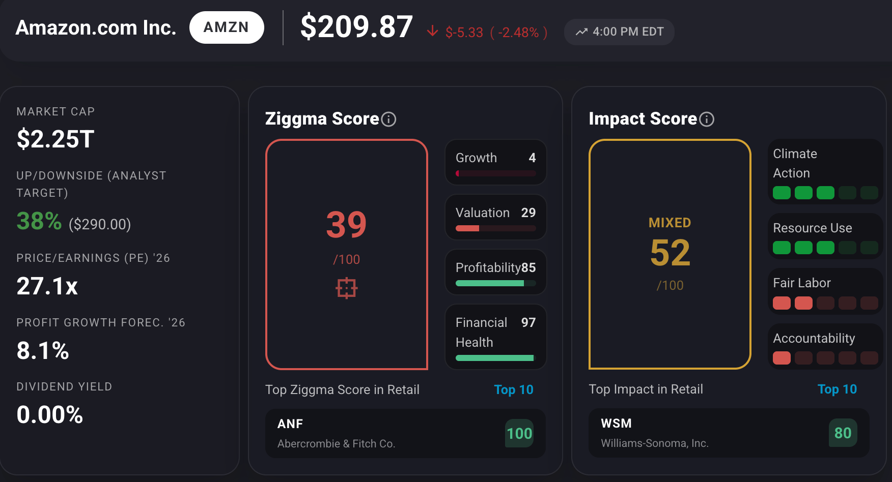 AMZN stock boasts a Ziggma score of 52, trailing peers in growth and valuation.