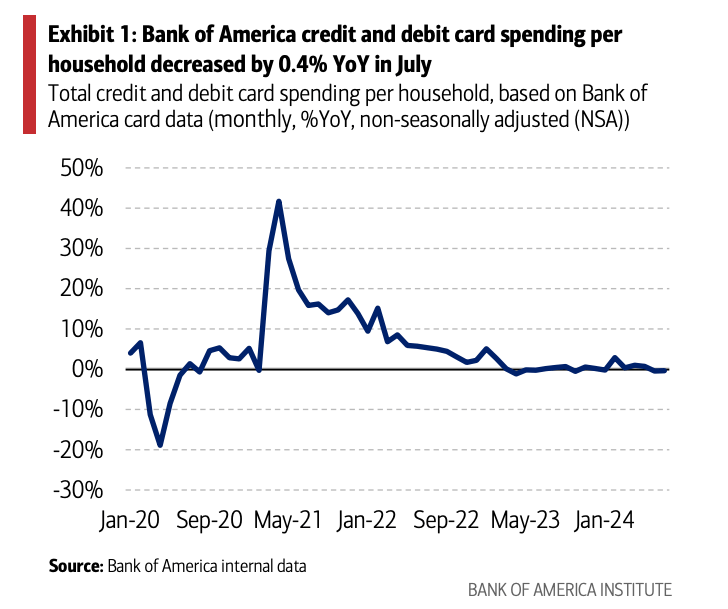 According to Bank of America, total credit card spending per household was down 1% year over year in the week ending August 10. It also fell 0.4% year over year in July.