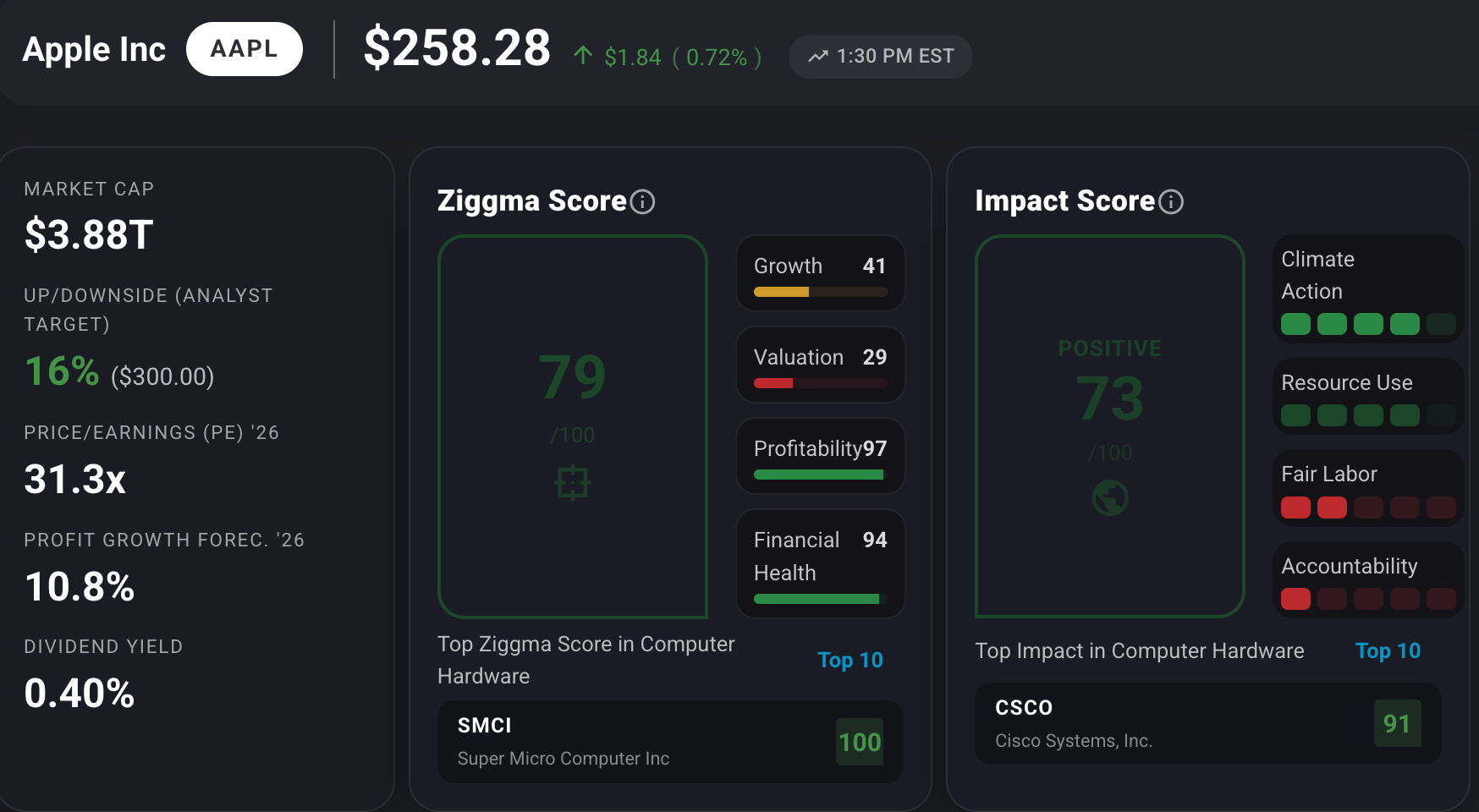 AAPL stock has a Ziggma score of 79 and trails its peers in growth and valuation.