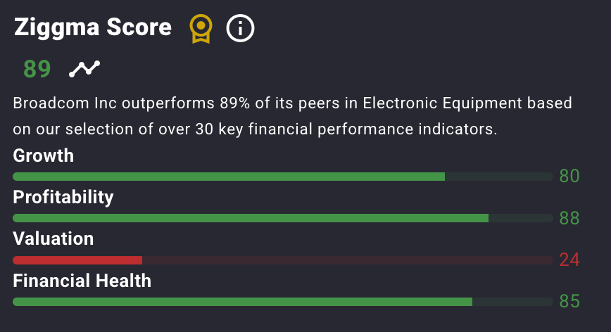 Broadcom stock has a Ziggma score of 89 and ranks above most peers in terms of profitability, growth, and financial health.