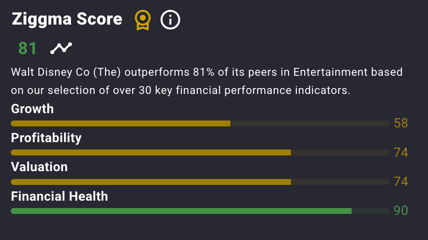 Disney stock has a Ziggma score of 81 and ranks above most peers in terms of profitability, valuation, and financial health.