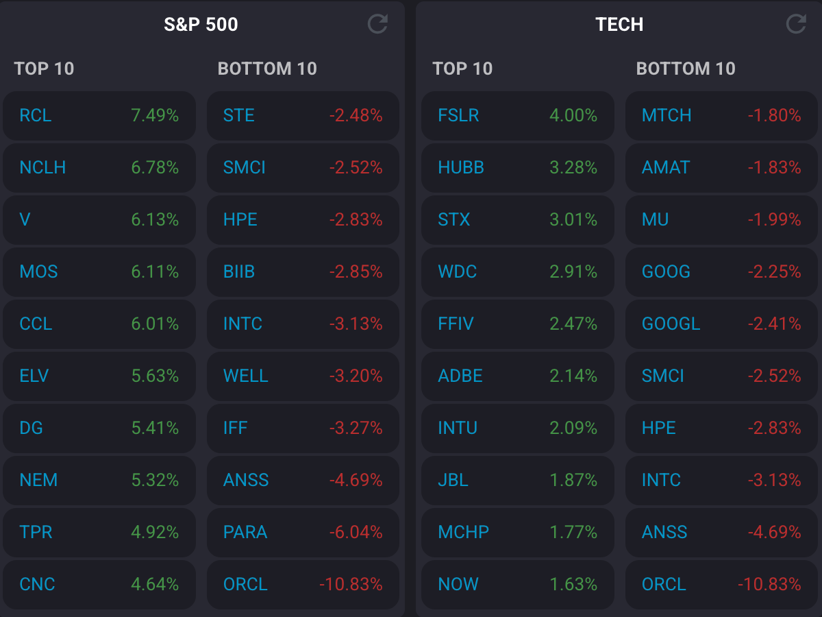 Oracle plummeted 11% despite beating earnings estimates, reporting $2.26 per share versus $1.64 expected.
