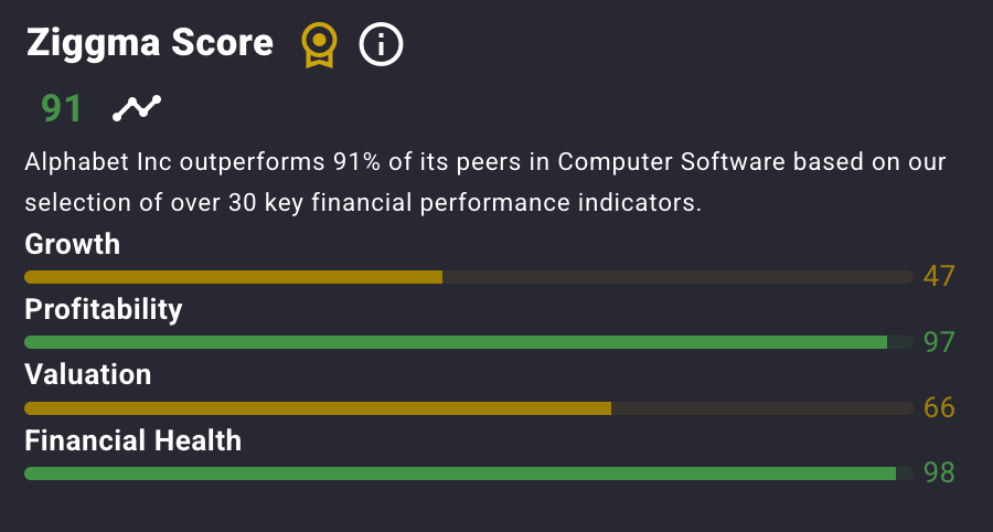 Alphabet stock has a Ziggma score of 91, and ranks in the top percentile for profitability and financial health.