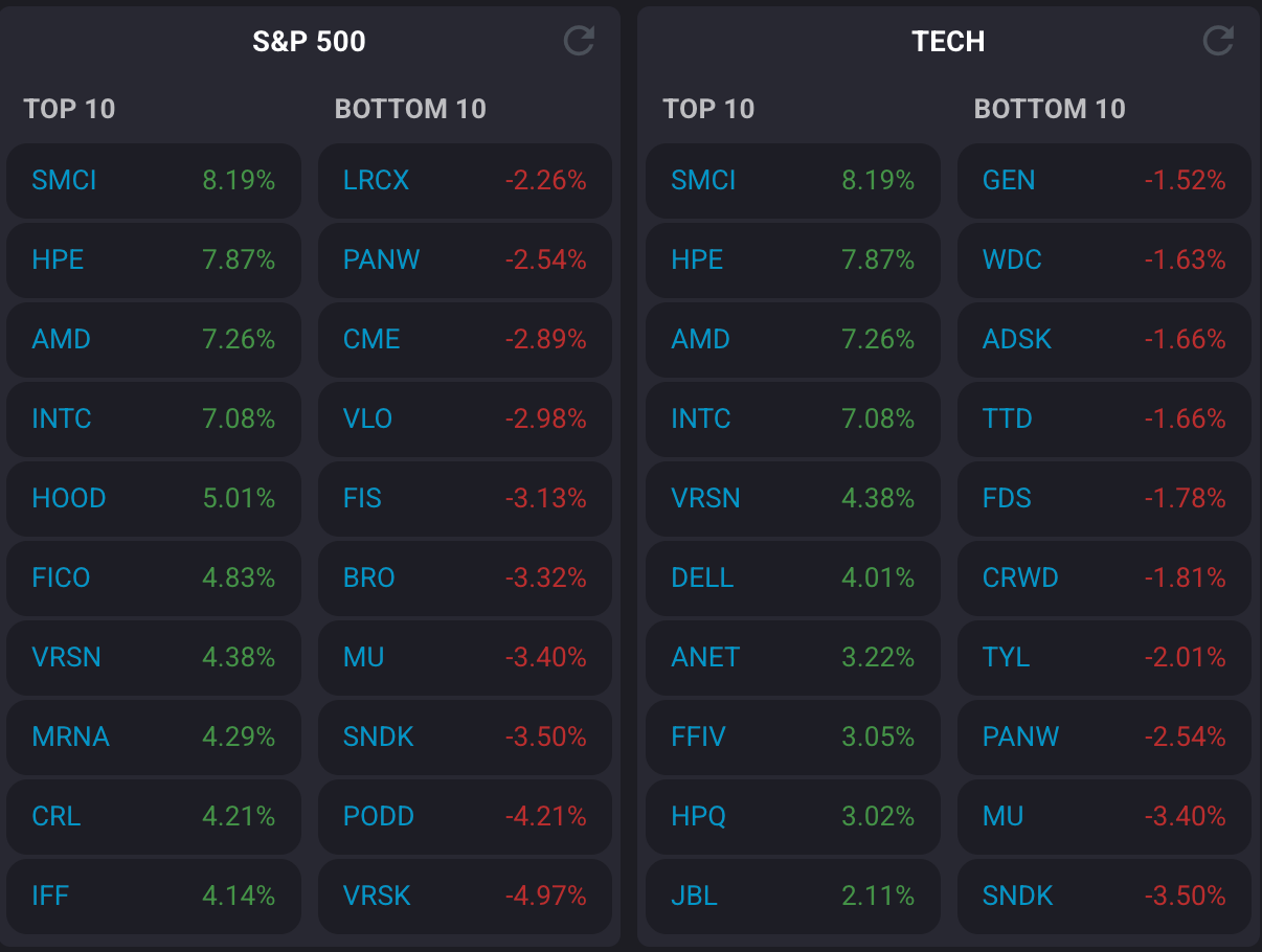 🤖 SMCI surged 8.2% after deepening its AI cloud partnership with Mirantis, supported by a blowout fiscal quarter with $12.68B in revenue — up 123% year-over-year.