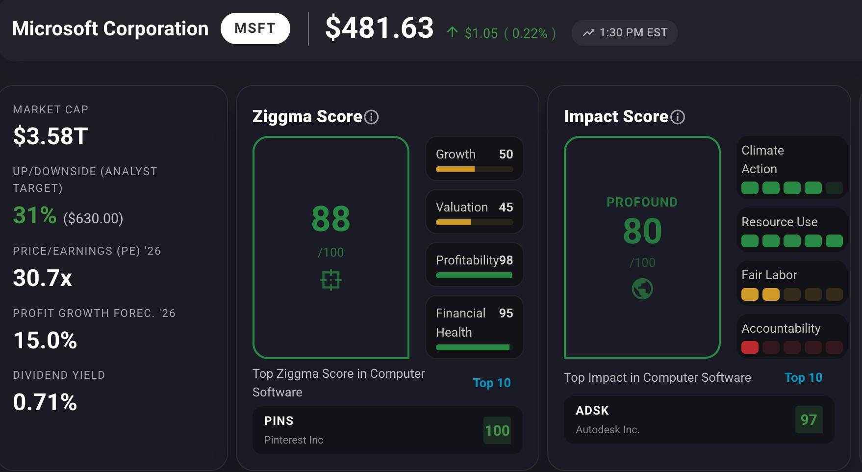 MSFT stock has a Ziggma score of 88 and trails its peers in growth and valuation.