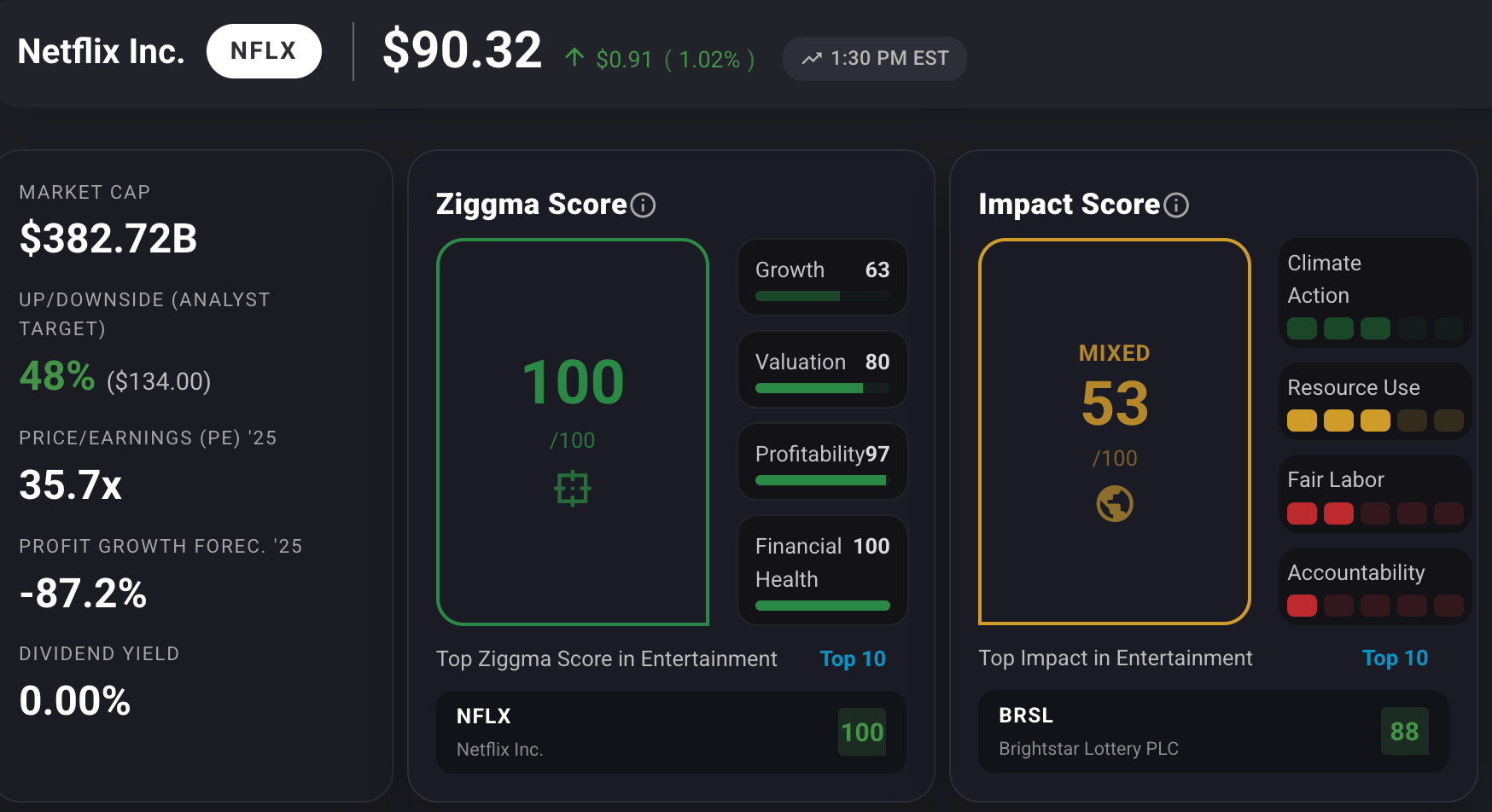 Netflix stock has a Ziggma score of 100 and ranks in the top percentile for valuation, profitability, and financial health.