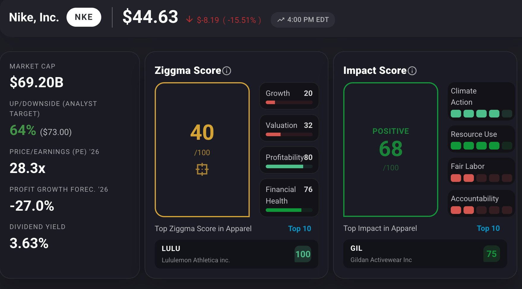 Nike stock has a Ziggma score of 40, as it ranks lower than its peers in growth and valuation.