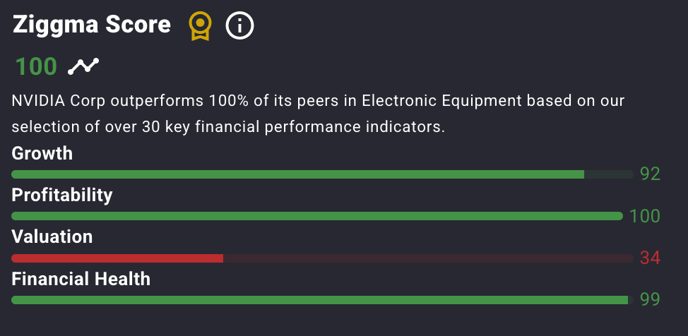 Nvidia stock has a Ziggma score of 100 and ranks highly in terms of profitability, growth, and financial health.