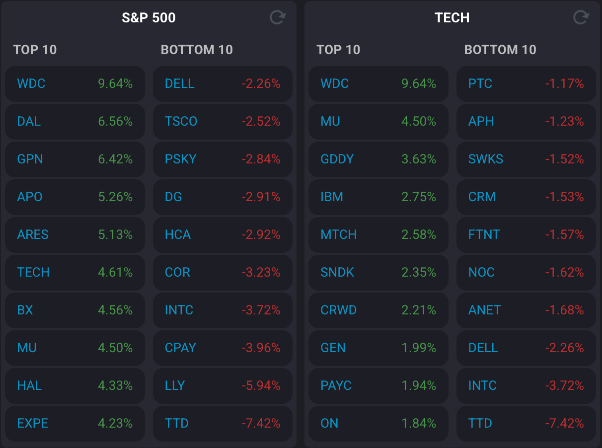 💾 Western Digital (WDC) surged 9.6% to an all-time high after reports revealed that its entire 2026 hard drive production capacity is already sold out, driven by demand for AI infrastructure from hyperscale cloud providers.