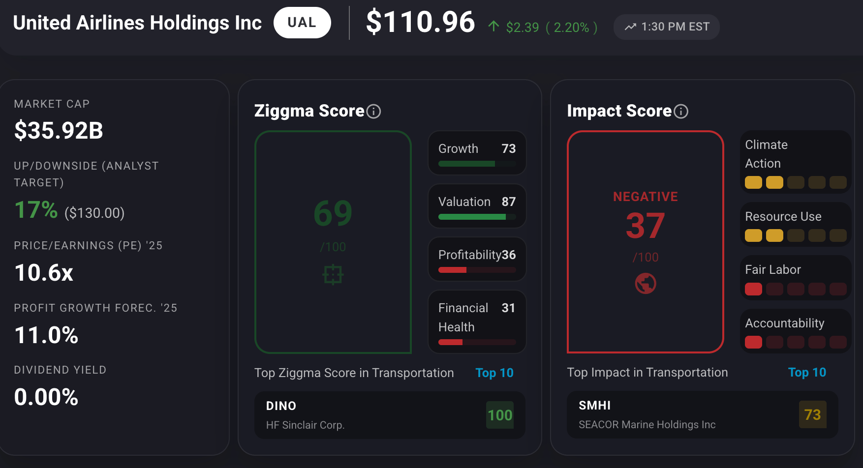 UAL stock has a Ziggma score of 69, ranking higher than peers in valuation and growth.