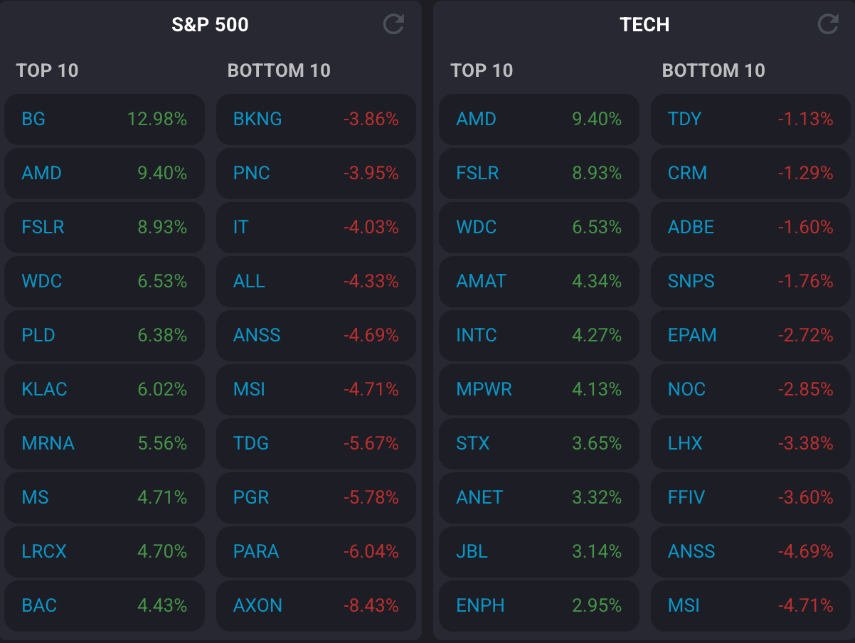 AMD surged on news that Oracle plans to deploy 50,000 of its next-generation MI300 AI chips in a massive data center buildout.