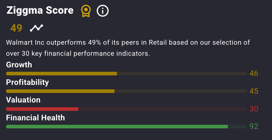 WMT stock has a Ziggma score of 49, as it trails peers across metrics such as growth, profitability, and valuation.